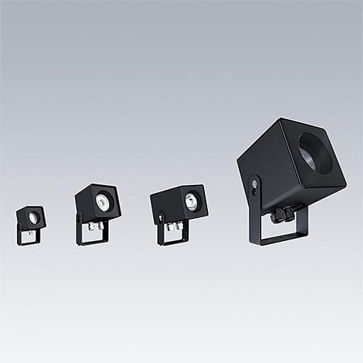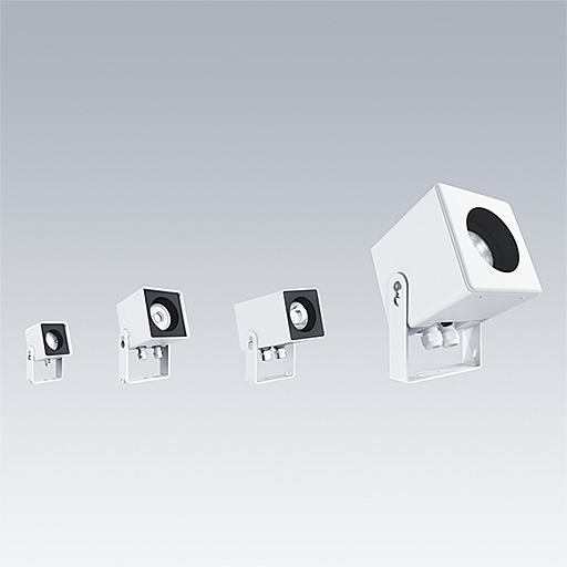 • Strahlerfamilie erhältlich in verschiedenen Größen, Farben, mit verschiedenen Optiken und Lichtleistungen; würfelförmige Ästhetik mit weichen abgerundeten Ecken