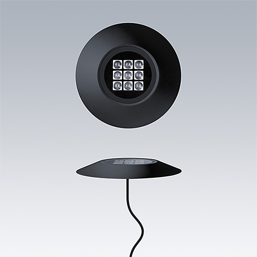 Cesar Bow plafonnier, luminaire à LED pour l'éclairage décoratif des façades, avec et distribution faisceau intensif. Classe électrique III. Convertisseur à distance DALI2. IP67, Résistance aux impacts : IK09. Boîtier : aluminium Moulage sous pression, thermopoudré texturé noir. Température de service de Température ambiante : -20°C à +40°C. Livré avec LED 3 000 K.