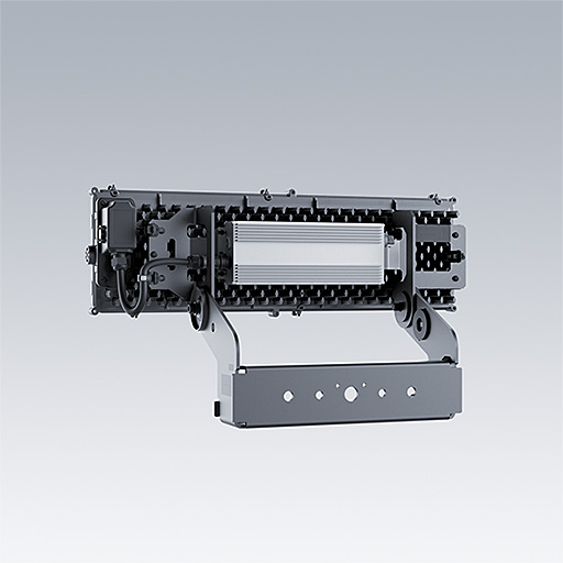 Projecteur à LED haute performance avec Optique 1 : asymétrique 60° , distribution Lumineuse à LED 144. Boîtier de commande performant intégré (courant d'entraînement maximal 1200mA) et câblage avec un câble de type H07 RN-F avec un petit diamètre de 13 mm. Classe électrique I, IP66, IK08. Dissipateur thermique : Moulage sous pression aluminium thermopoudré gris foncé (similaire à RAL 7043). Crosse de montage et cadre : gris foncé (similaire à RAL 7043). Vasque : 4 mm transparent verre. La crosse est montée en utilisant différents types de fixation (une vis M20 ou deux vis M14). Fonctionnement à faible scintillement (< 1%) parfaitement adapté à une diffusion HDTV. Livré avec LED 4 000 K