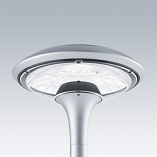 Plurio Direct : Lanterne LED décorative à montage top avec distribution Radialement symétrique. Driver avec 18 LED entraînés à 350mA. Classe électrique II, IP66, IK08. Base : coulé aluminium, thermopoudré gris argent. Chapeau : forme disque, aluminium, texturé gris argent. Diffuseur : anti-UV, transparent Polycarbonate (PC) avec prismes anti-éblouissement. Optique à lentille direct avec réflecteur interne Equipé d'un 50% circuit de réduction de puissance, qui entre en vigueur 3 heures avant et 5 heures après un minuit calculé. Il peut être désactivé à l'installation avec un interrupteur interne facilement accessible. Livré avec LED 4 000 K. Montage top sur mât de Ø 60mm.