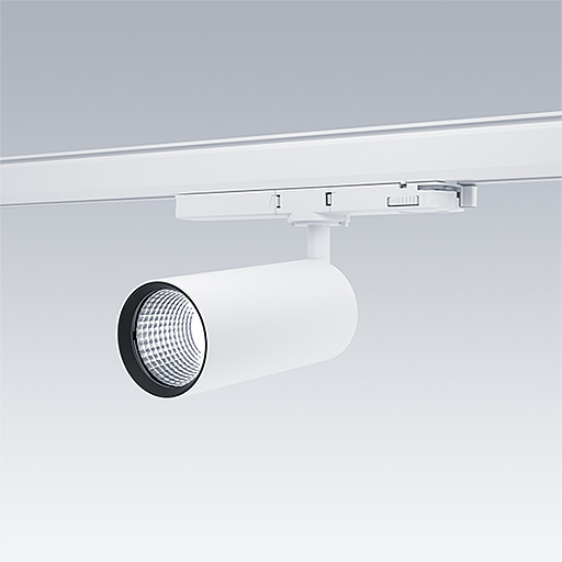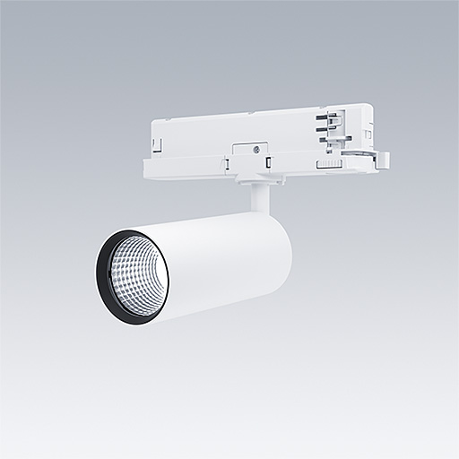 Projecteur LED pour installation sur rail triphasé avec distribution lumineuse de type projection et température de couleur stabilisée. Electronique, non gradable. Classe électrique II, IP20. Corps : aluminium Moulage sous pression, peinture microtexturée blanc. Réflecteur : PC poudré. Projecteur orientable sur le plan horizontal de 360° et inclinable sur le plan vertical de 90°. Livré avec LED 4 000 K